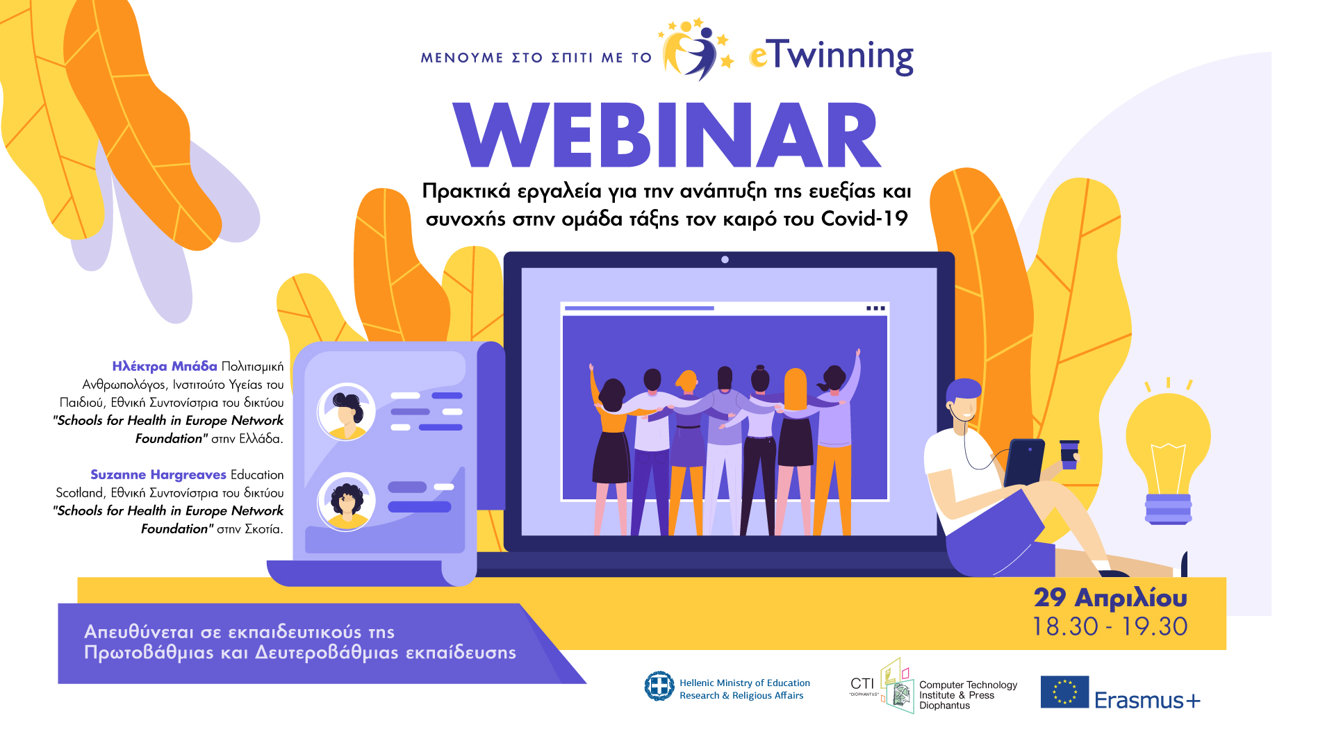 Η ελληνική Εθνική Υπηρεσία Υποστήριξης της δράσης eTwinning στο πλαίσιο των δράσεων 'eTwinning to support closed schools' και ‘Μένουμε στο Σπίτι με το eTwinning’ έχει προγραμματίσει να υλοποιήσει το διαδικτυακό σεμινάριο (webinar) με θέμα: «Πρακτικά εργαλεία για την ανάπτυξη της ευεξίας και συνοχής στην ομάδα τάξης τον καιρό του Covid-19», το οποίο απευθύνεται σε εκπαιδευτικούς Πρωτοβάθμιας και Δευτεροβάθμιας Εκπαίδευσης και συγκεκριμένα σε εκπαιδευτικούς όλων των ειδικοτήτων που διδάσκουν σε όλες τις τάξεις του Δημοτικού και του Γυμνασίου.