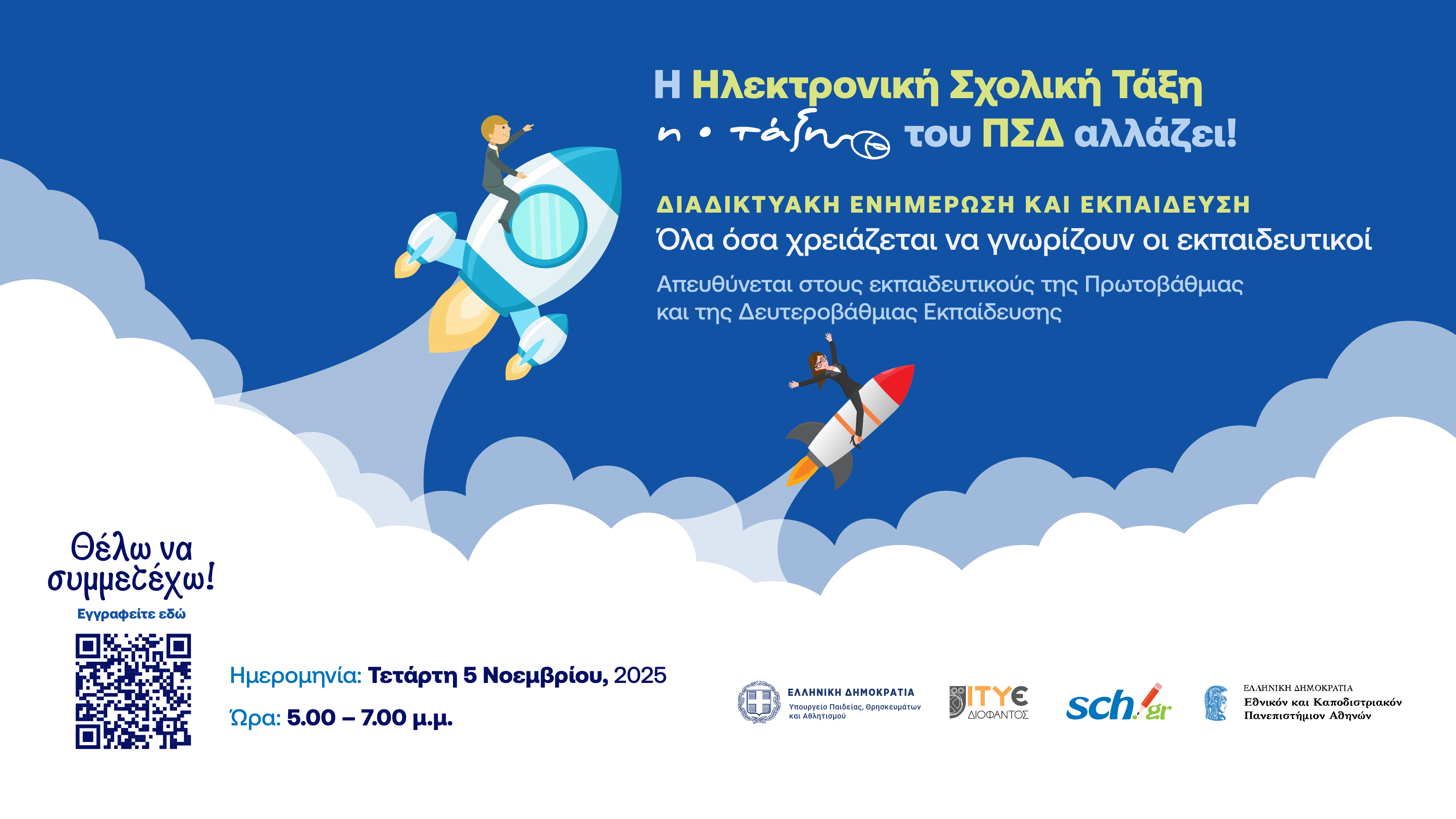 Το Πανελλήνιο Σχολικό Δίκτυο (ΠΣΔ), σε συνεργασία με την ομάδα ανάπτυξης της πλατφόρμας eClass (ΕΚΠΑ) και τον Σύμβουλο Εκπαίδευσης Φυσικών Επιστημών κ. Μανώλη Κουσλόγλου, συνδιοργανώνουν την Τετάρτη 5 Νοεμβρίου 2025 και ώρα 5.00 - 7.00 μ.μ. διαδικτυακή ενημέρωση και εκπαίδευση με θέμα: