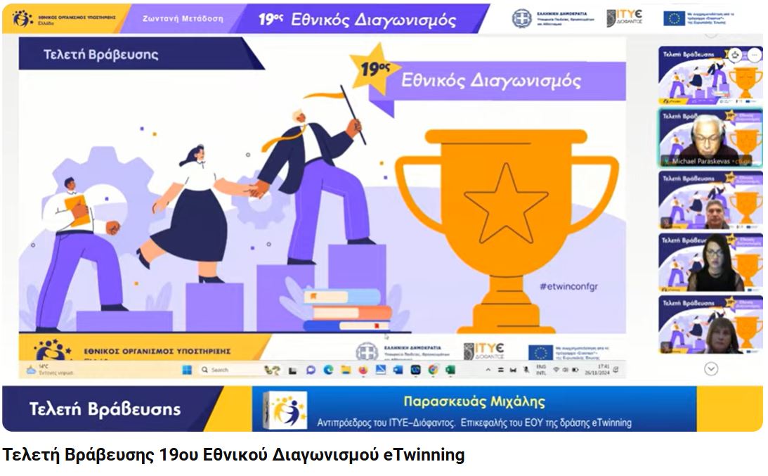 Ο Εθνικός Οργανισμός Υποστήριξης (ΕΟΥ) eTwinning, διοργάνωσε με επιτυχία τη διαδικτυακή εκδήλωση για τη βράβευση των νικητών/τριών στο πλαίσιο του 19ου Εθνικού Διαγωνισμού, την Τρίτη 26 Νοεμβρίου 2024 στις 17:30.