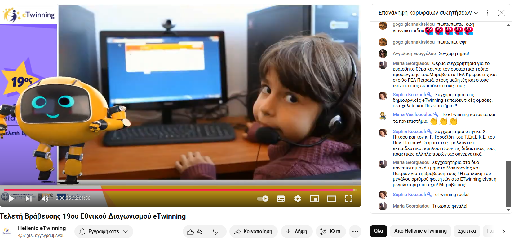 Η τελετή πραγματοποιήθηκε μέσω της πλατφόρμας webex, ενώ παράλληλα υπήρχε ζωντανή αναμετάδοση από το κανάλι του ΕΟΥ eTwinning. Υπήρξε παρακολούθηση της τελετής από μεγάλο αριθμό εκπαιδευτικών από διαφορετικά σημεία της Ελλάδας !