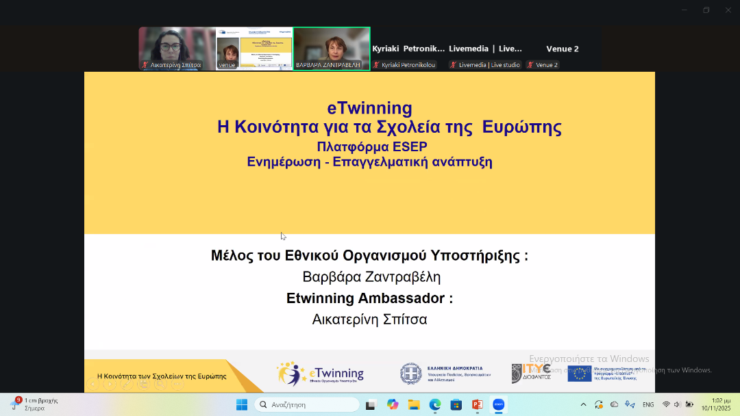 Κατά τη διάρκεια της εισήγησης αναδείχθηκαν τα πολλαπλά οφέλη για τους εκπαιδευτικούς και τους μαθητές, η στενή σύνδεση του eTwinning με το πρόγραμμα Erasmus+ , καθώς και οι ευκαιρίες επαγγελματικής ανάπτυξης και ευρωπαϊκής αναγνώρισης που προσφέρει το πρόγραμμα στην εκπαιδευτική κοινότητα.